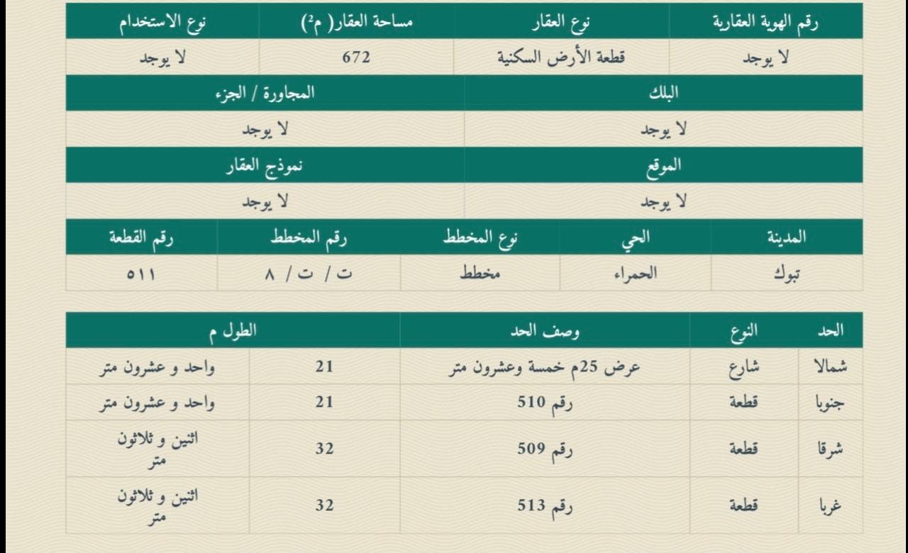 للبيع أرض تجاري سكني بحي الحمراء رقم 511 شماليه شارع 25 متر والمساحه 672 متر