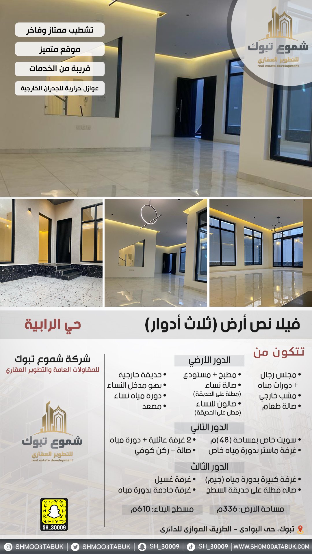 يتكون الدورالأرضي من: مجلس رجال + دورات مياه – مشب خارجي – صالة طعام -مطبخ +مستودع -صالة نساء -1 دورة مياه – حديقة خارجية – مصعد
