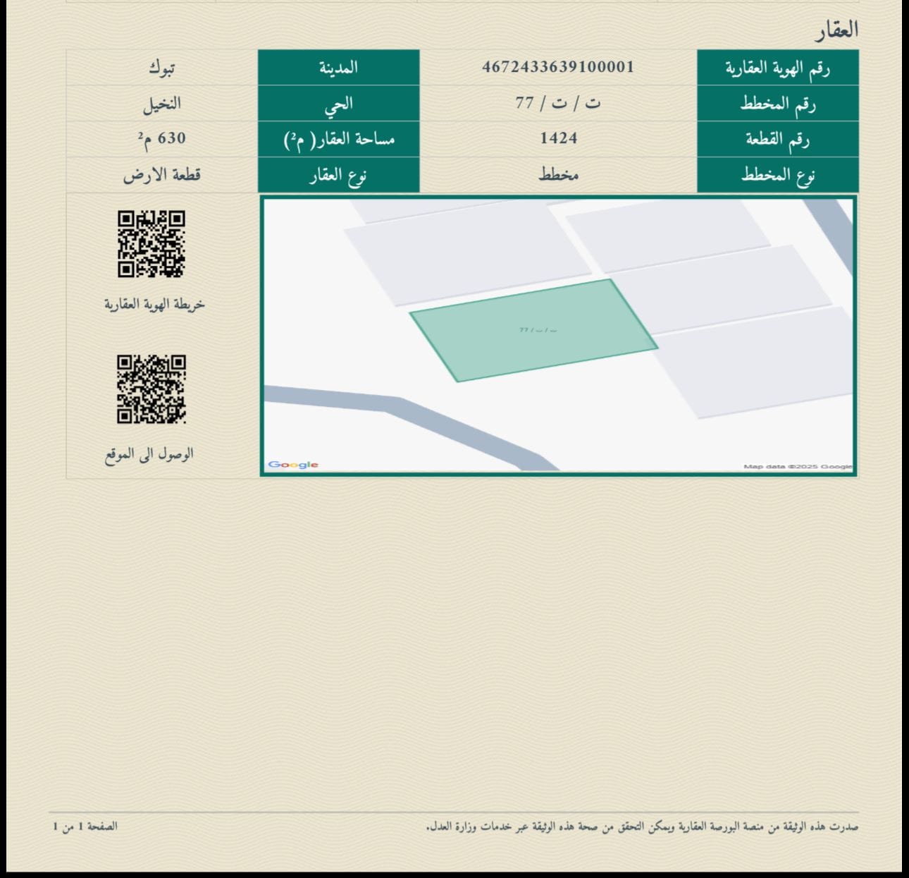 المساحه / 630 متر غربيه شارع 25 متر