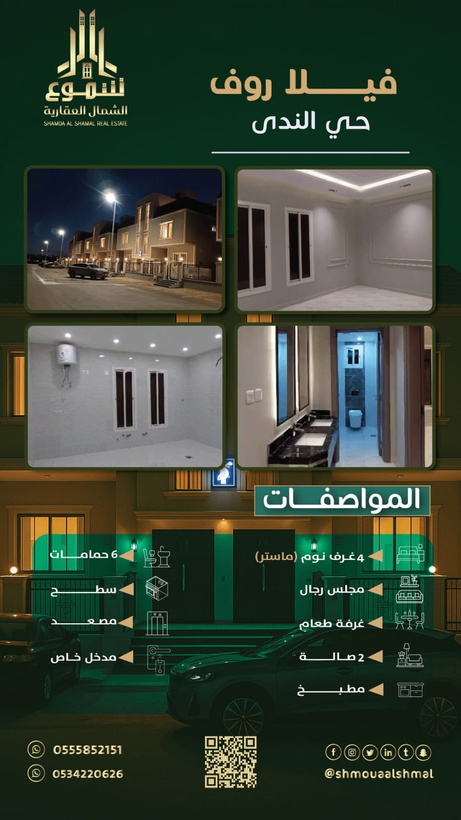 فيلا روف علوي بحي الندى بمستوى راقٍ وتوزيع مثالي يجمع بين الخصوصية والراحة؛ أربع غرف ماستر تمنح العائلة رفاهية كاملة، مع مجلس ومقلط للاستقبال وصالتين للمعيشة، إضافة إلى سطح واسع ومصعد ومدخل مستقل—خيار ممتاز للسكن الفاخر.