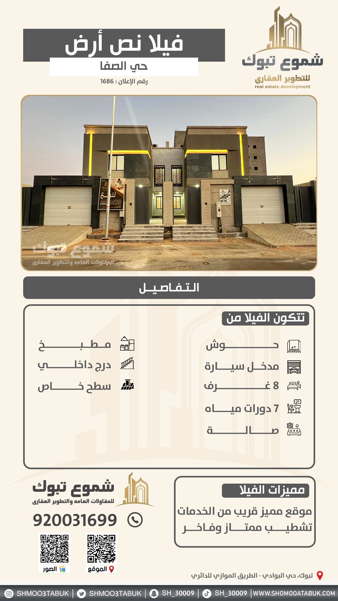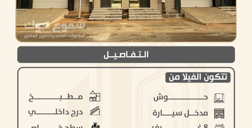 3 ادوار -حوش – مدخل سيارة – 2 مجلس -8 غرف – 7 دورات مياه – صالة – مطبخ – درج داخلي – سطح خاص – مصعد مؤسس
