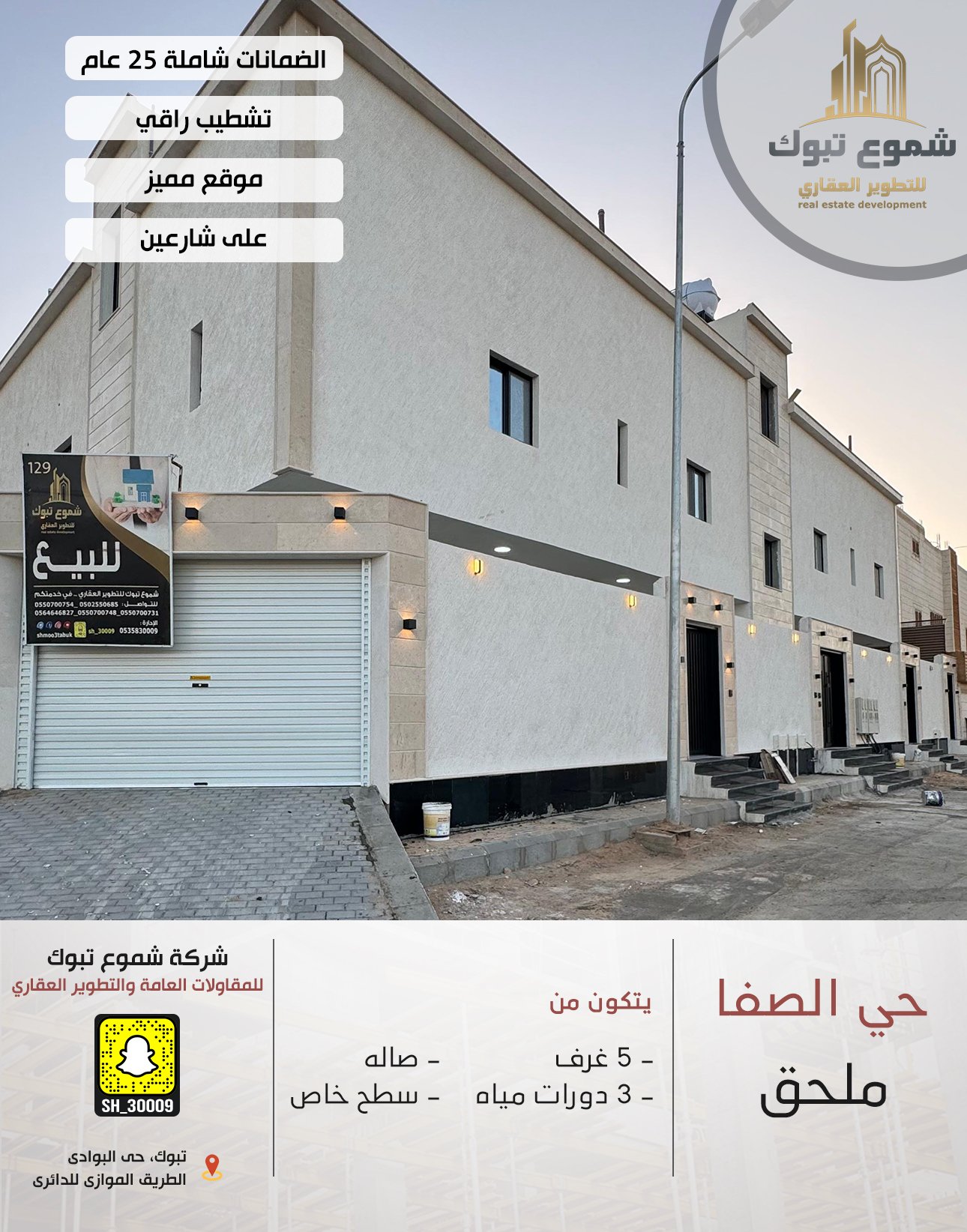 مشاهدة الممتلكات ملحق 7 غرف بحي الصفا - تبوك ملحق حي الصفا ملحق حي الصفا – تبوك يتكون من: lمصعد راكب –… غرف نوم 5 الحمامات 5 منطقة 250 متر مربع للبيع SAR680,000